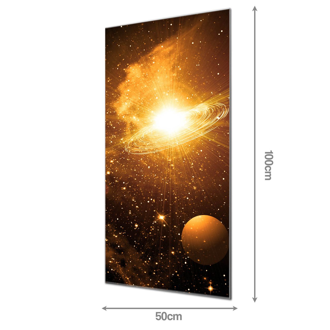 Material: 4mm Sicherheitsglas mit Metallrückwand Eigenschaften: beschreibbar, magnetisch, kratzfest Maße: 50x100x0,6cm, 7,50 kg schwer Motiv Nummer 10419 Outer Space Zubehör: inklusive 4 Neodym-Magnete