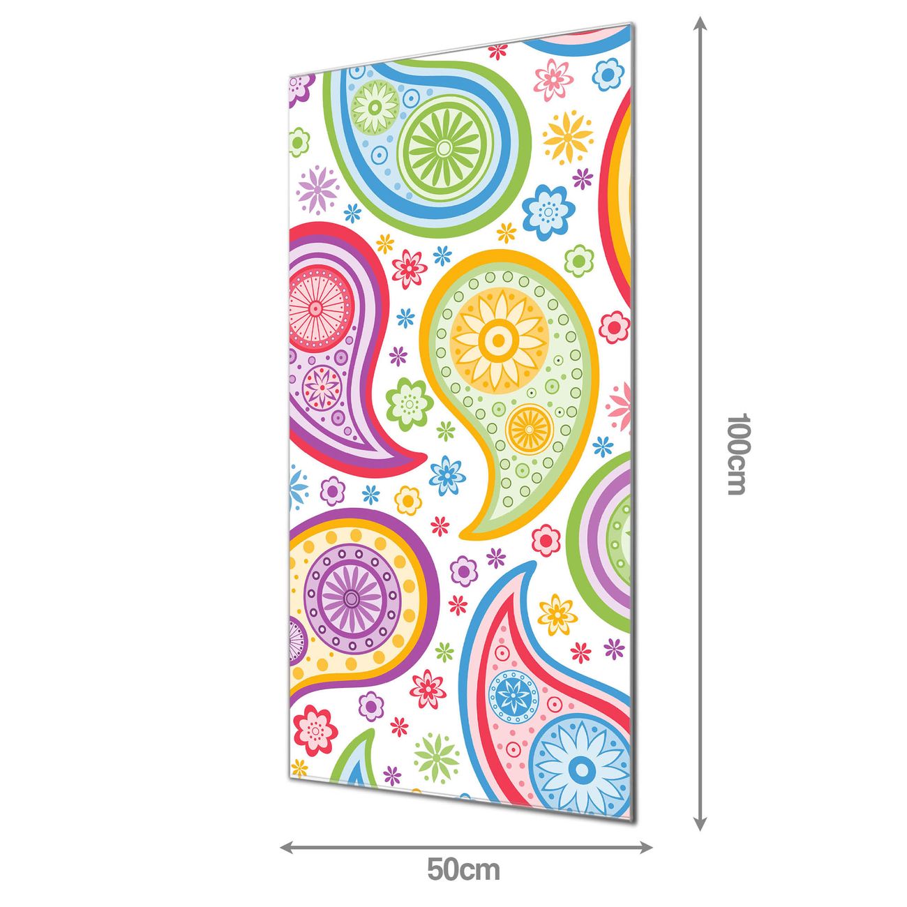 Material: 4mm Sicherheitsglas mit Metallrückwand Eigenschaften: beschreibbar, magnetisch, kratzfest Maße: 50x100x0,6cm, 7,50 kg schwer Motiv Nummer 10066 Paisley bunt Zubehör: inklusive 4 Neodym-Magnete