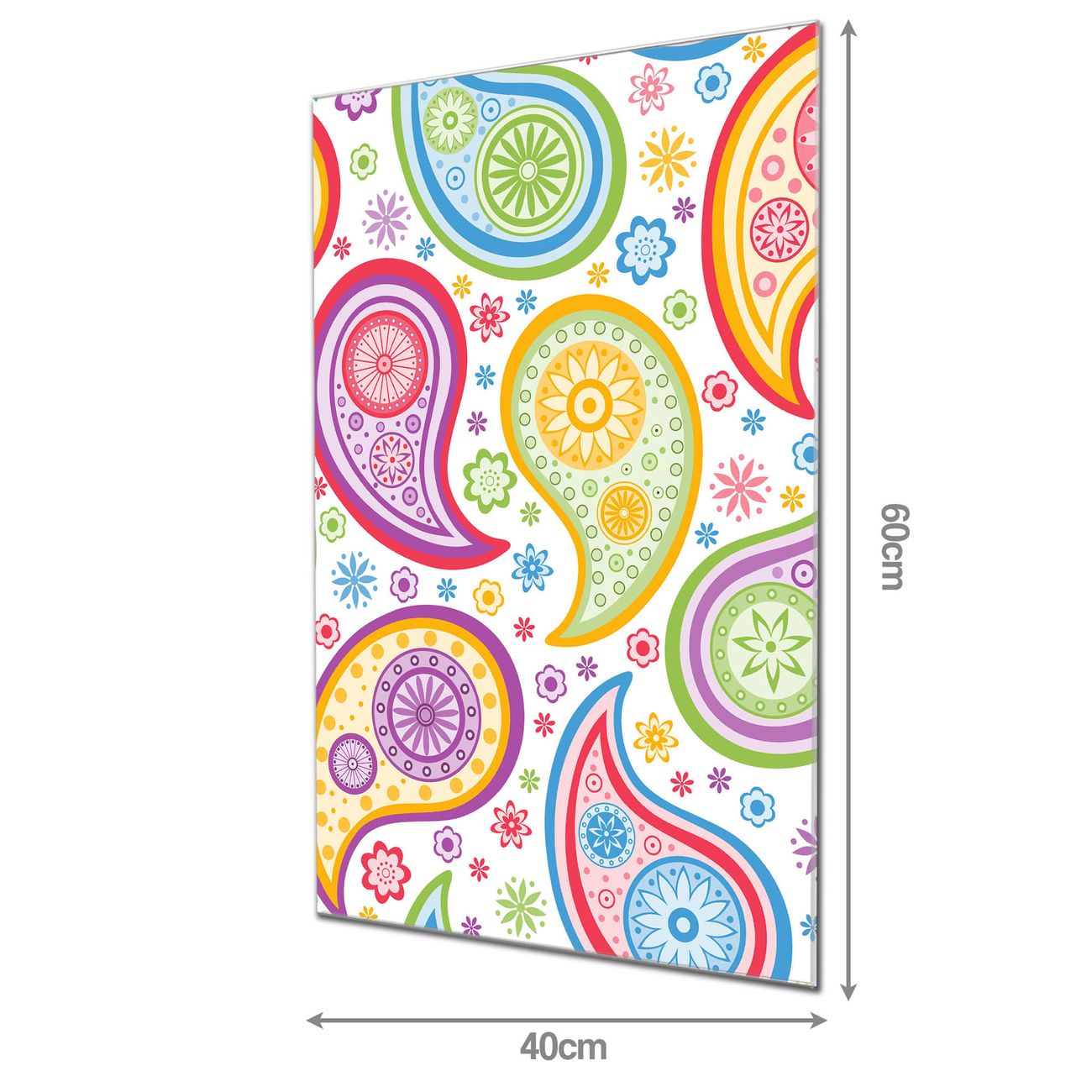 Material: 4mm Sicherheitsglas mit Metallrückwand Eigenschaften: beschreibbar, magnetisch, kratzfest Maße: 40x60x0,6cm, 3,60 kg schwer Motiv Nummer 10066 Paisley bunt Zubehör: inklusive 4 Neodym-Magnete