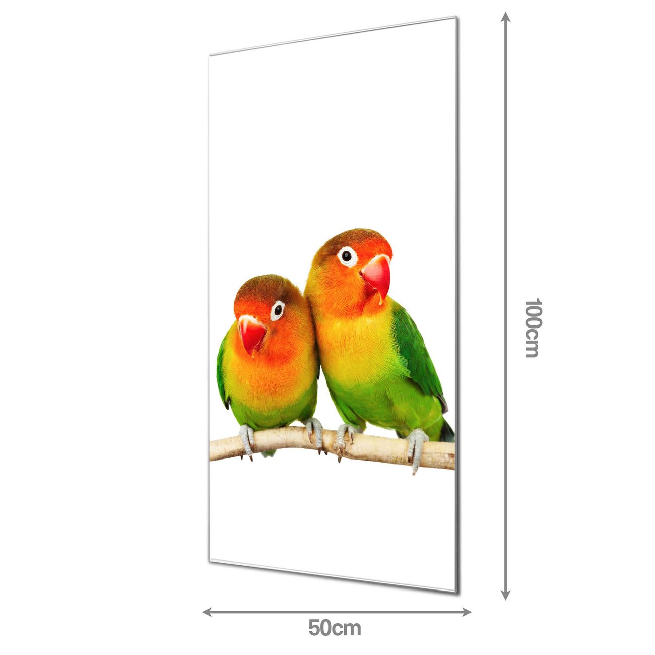 Material: 4mm Sicherheitsglas mit Metallrückwand Eigenschaften: beschreibbar, magnetisch, kratzfest Maße: 50x100x0,6cm, 7,50 kg schwer Motiv Nummer 10148 Papageien Zubehör: inklusive 4 Neodym-Magnete