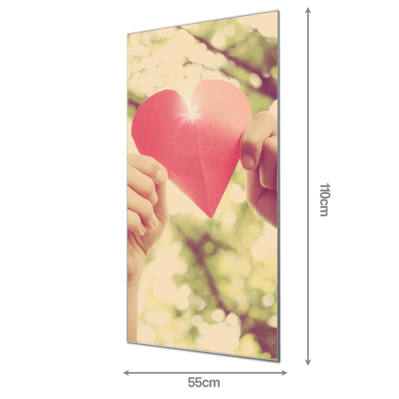 Material: 4mm Sicherheitsglas mit Metallrückwand Eigenschaften: beschreibbar, magnetisch, kratzfest Maße: 55x110x0,6cm, 9,08 kg schwer Motiv Nummer 12709 Papierherz Zubehör: inklusive 4 Neodym-Magnete