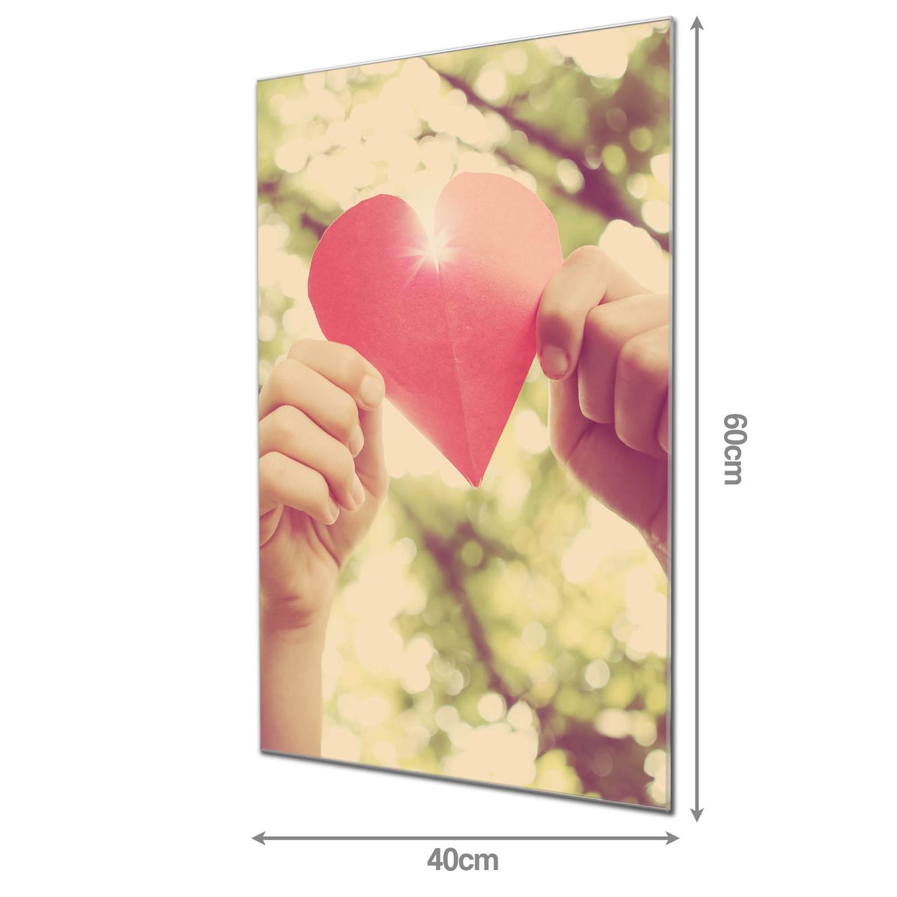 Material: 4mm Sicherheitsglas mit Metallrückwand Eigenschaften: beschreibbar, magnetisch, kratzfest Maße: 40x60x0,6cm, 3,60 kg schwer Motiv Nummer 12709 Papierherz Zubehör: inklusive 4 Neodym-Magnete