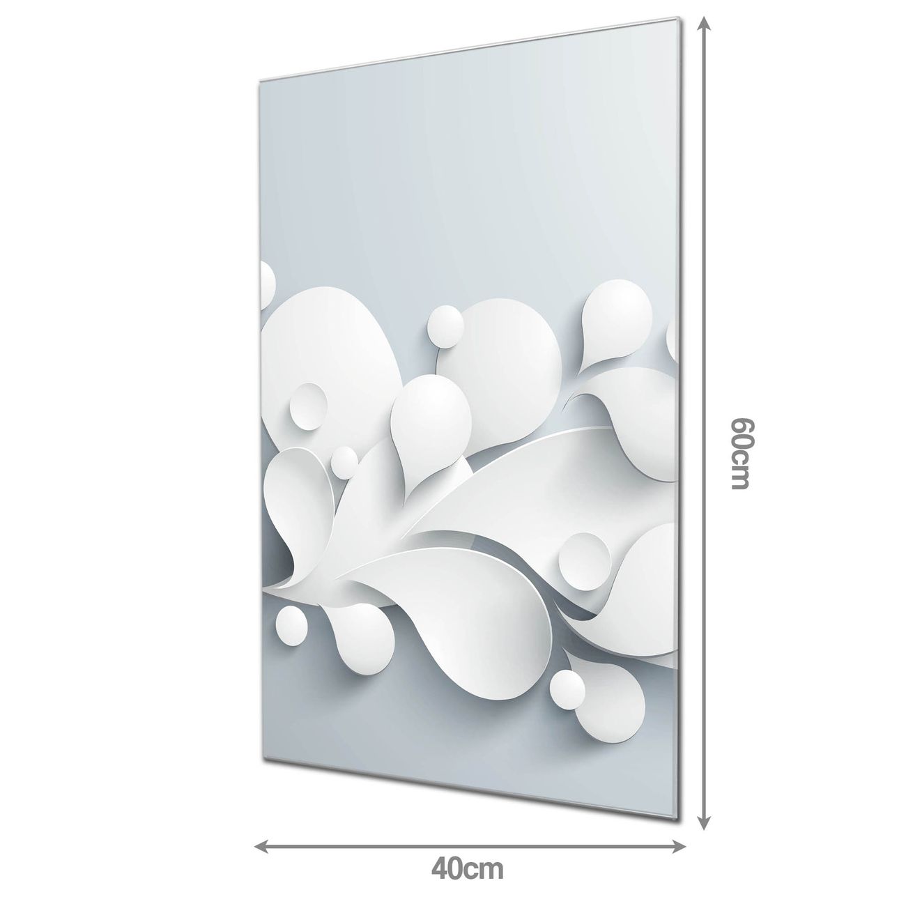 Material: 4mm Sicherheitsglas mit Metallrückwand Eigenschaften: beschreibbar, magnetisch, kratzfest Maße: 40x60x0,6cm, 3,60 kg schwer Motiv Nummer 12452 Papiertropfen Zubehör: inklusive 4 Neodym-Magnete