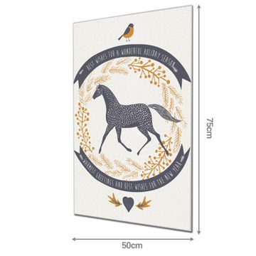 Material: 4mm Sicherheitsglas mit Metallrückwand Eigenschaften: beschreibbar, magnetisch, kratzfest Maße: 50x75x0,6cm, 5,63 kg schwer Motiv Nummer 12646 Pferd und Vogel Zubehör: inklusive 4 Neodym-Magnete