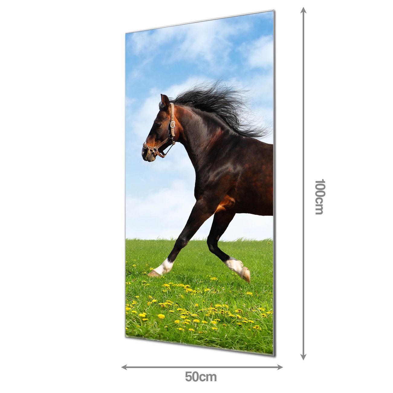 Material: 4mm Sicherheitsglas mit Metallrückwand Eigenschaften: beschreibbar, magnetisch, kratzfest Maße: 50x100x0,6cm, 7,50 kg schwer Motiv Nummer 10021 Pferd Zubehör: inklusive 4 Neodym-Magnete