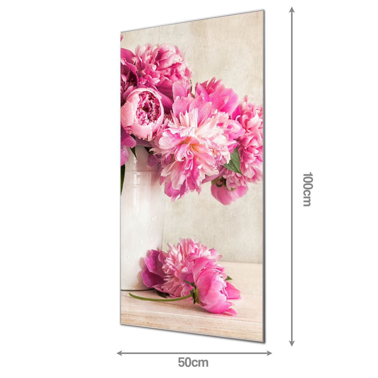 Material: 4mm Sicherheitsglas mit Metallrückwand Eigenschaften: beschreibbar, magnetisch, kratzfest Maße: 50x100x0,6cm, 7,50 kg schwer Motiv Nummer 10440 Pfingstrose Zubehör: inklusive 4 Neodym-Magnete