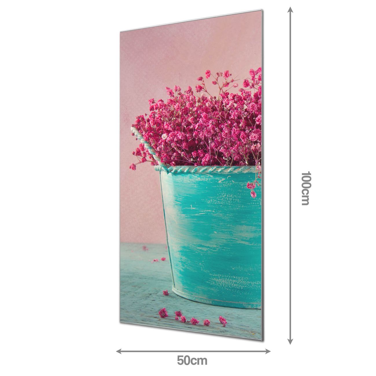 Material: 4mm Sicherheitsglas mit Metallrückwand Eigenschaften: beschreibbar, magnetisch, kratzfest Maße: 50x100x0,6cm, 7,50 kg schwer Motiv Nummer 12662 Pinke Trockenblumen Zubehör: inklusive 4 Neodym-Magnete