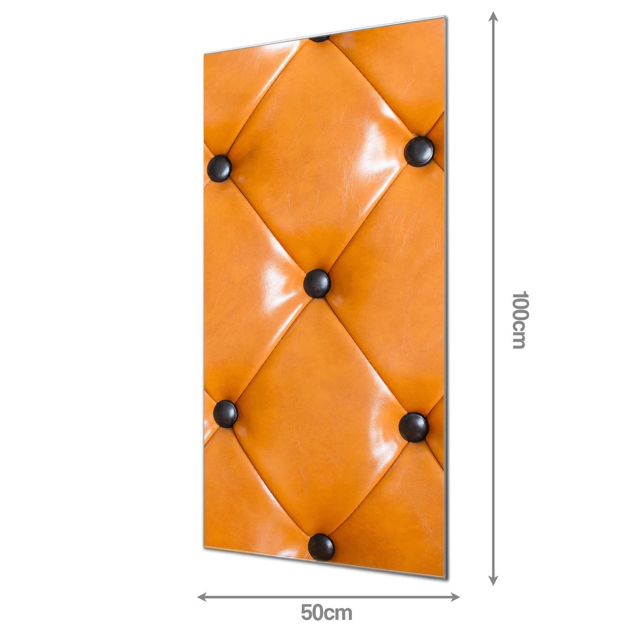 Material: 4mm Sicherheitsglas mit Metallrückwand Eigenschaften: beschreibbar, magnetisch, kratzfest Maße: 50x100x0,6cm, 7,50 kg schwer Motiv Nummer 11932 Polster Orange Zubehör: inklusive 4 Neodym-Magnete