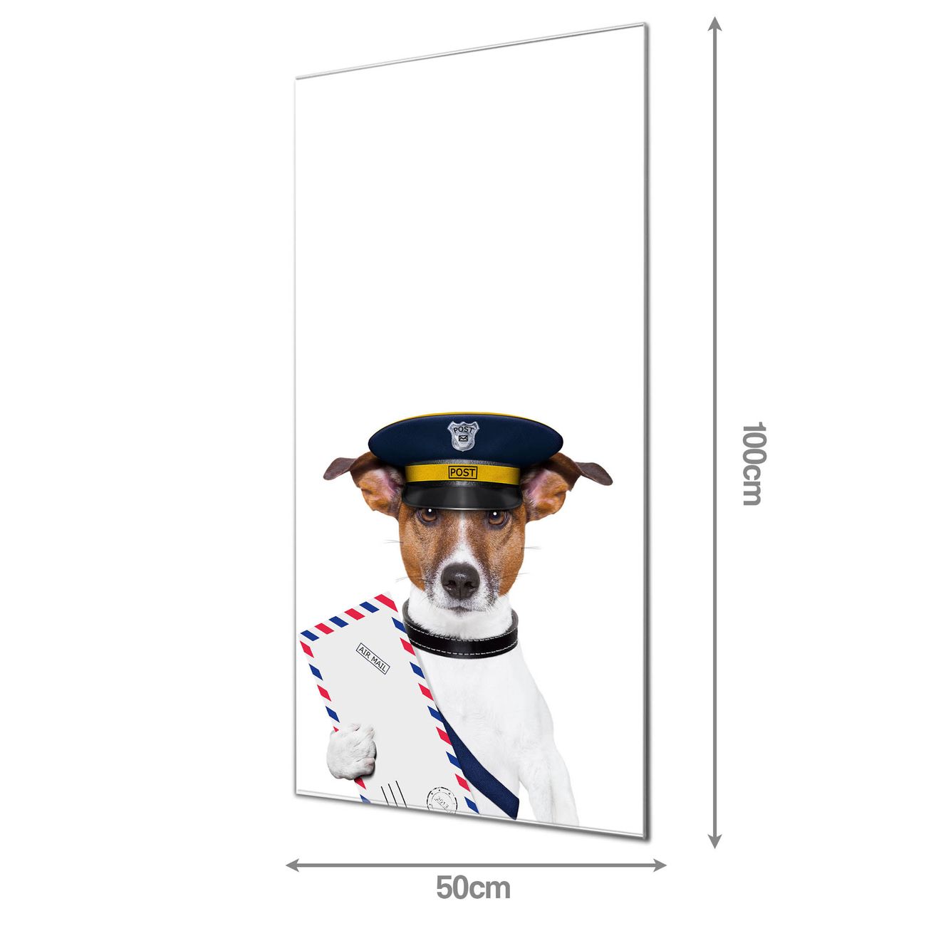 Material: 4mm Sicherheitsglas mit Metallrückwand Eigenschaften: beschreibbar, magnetisch, kratzfest Maße: 50x100x0,6cm, 7,50 kg schwer Motiv Nummer 10474 Postbote Jack Russel Zubehör: inklusive 4 Neodym-Magnete