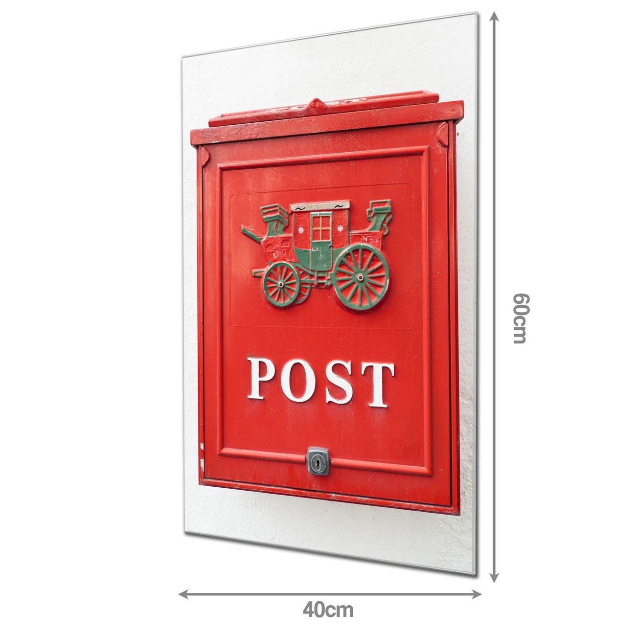 Material: 4mm Sicherheitsglas mit Metallrückwand Eigenschaften: beschreibbar, magnetisch, kratzfest Maße: 40x60x0,6cm, 3,60 kg schwer Motiv Nummer 10485 Postkasten Nostalgie Zubehör: inklusive 4 Neodym-Magnete
