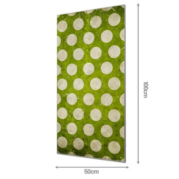 Material: 4mm Sicherheitsglas mit Metallrückwand Eigenschaften: beschreibbar, magnetisch, kratzfest Maße: 50x100x0,6cm, 7,50 kg schwer Motiv Nummer 11267 Punkte Grün Vintage Zubehör: inklusive 4 Neodym-Magnete