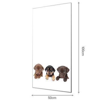 Material: 4mm Sicherheitsglas mit Metallrückwand Eigenschaften: beschreibbar, magnetisch, kratzfest Maße: 50x100x0,6cm, 7,50 kg schwer Motiv Nummer 10478 Puppies Zubehör: inklusive 4 Neodym-Magnete