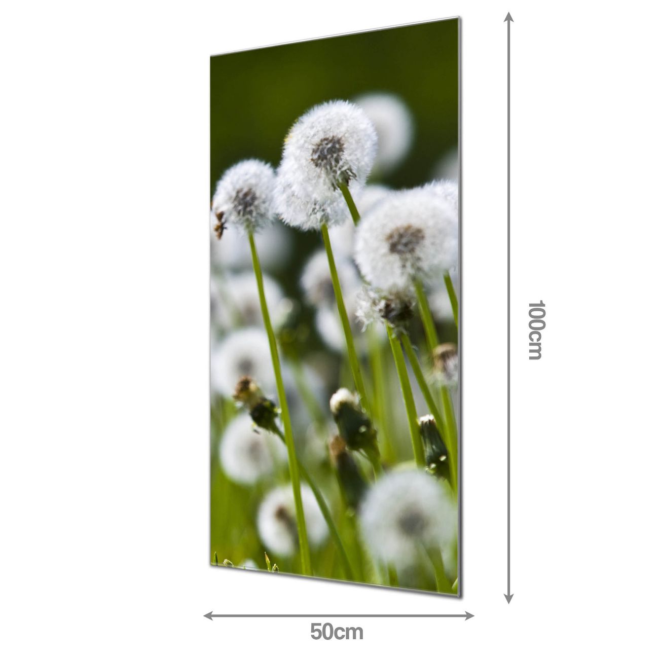 Material: 4mm Sicherheitsglas mit Metallrückwand Eigenschaften: beschreibbar, magnetisch, kratzfest Maße: 50x100x0,6cm, 7,50 kg schwer Motiv Nummer 12277 Pusteblumenwiese Zubehör: inklusive 4 Neodym-Magnete