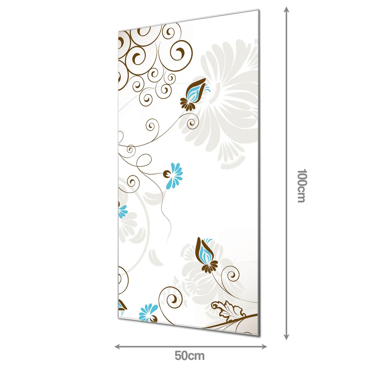 Material: 4mm Sicherheitsglas mit Metallrückwand Eigenschaften: beschreibbar, magnetisch, kratzfest Maße: 50x100x0,6cm, 7,50 kg schwer Motiv Nummer 11339 Rankenrahmen Zubehör: inklusive 4 Neodym-Magnete