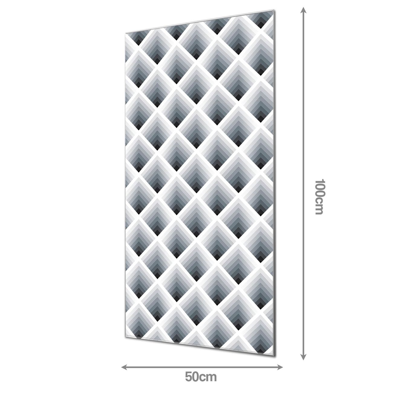 Material: 4mm Sicherheitsglas mit Metallrückwand Eigenschaften: beschreibbar, magnetisch, kratzfest Maße: 50x100x0,6cm, 7,50 kg schwer Motiv Nummer 11937 Raster 3D Grau Zubehör: inklusive 4 Neodym-Magnete