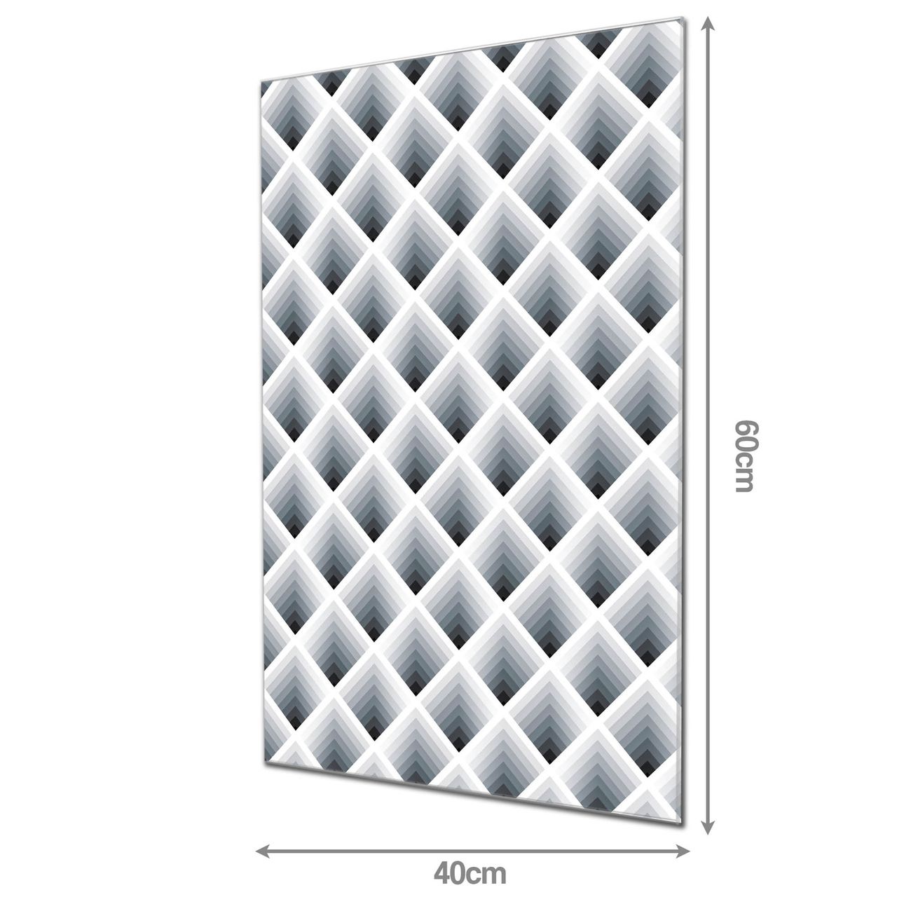 Material: 4mm Sicherheitsglas mit Metallrückwand Eigenschaften: beschreibbar, magnetisch, kratzfest Maße: 40x60x0,6cm, 3,60 kg schwer Motiv Nummer 11937 Raster 3D Grau Zubehör: inklusive 4 Neodym-Magnete
