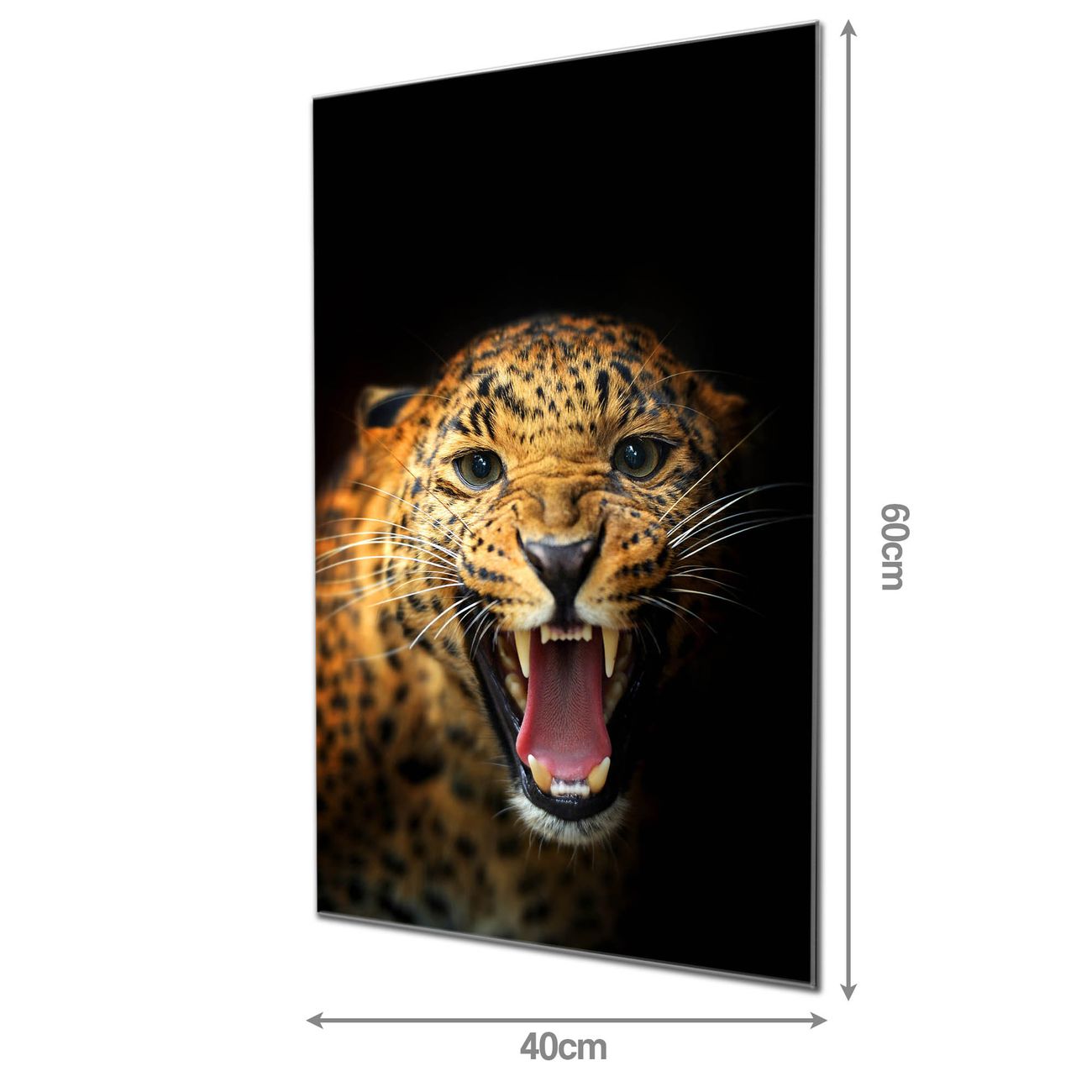 Material: 4mm Sicherheitsglas mit Metallrückwand Eigenschaften: beschreibbar, magnetisch, kratzfest Maße: 40x60x0,6cm, 3,60 kg schwer Motiv Nummer 10499 Raubkatze Zubehör: inklusive 4 Neodym-Magnete