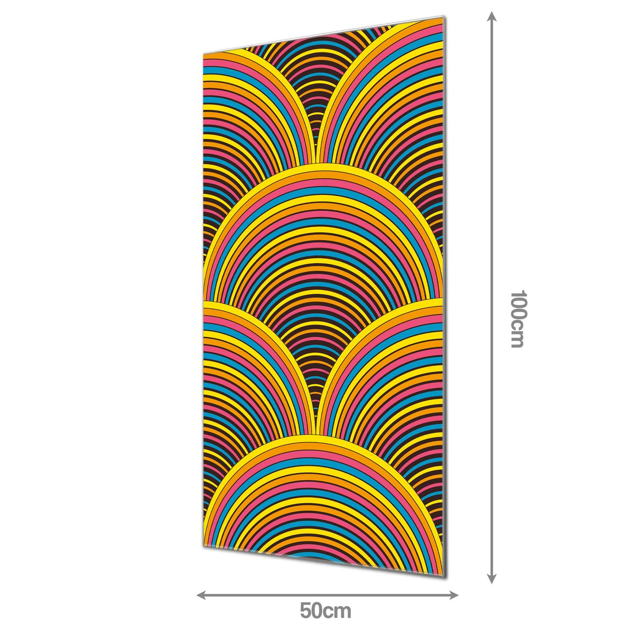 Material: 4mm Sicherheitsglas mit Metallrückwand Eigenschaften: beschreibbar, magnetisch, kratzfest Maße: 50x100x0,6cm, 7,50 kg schwer Motiv Nummer 12018 Regenbögen Zubehör: inklusive 4 Neodym-Magnete