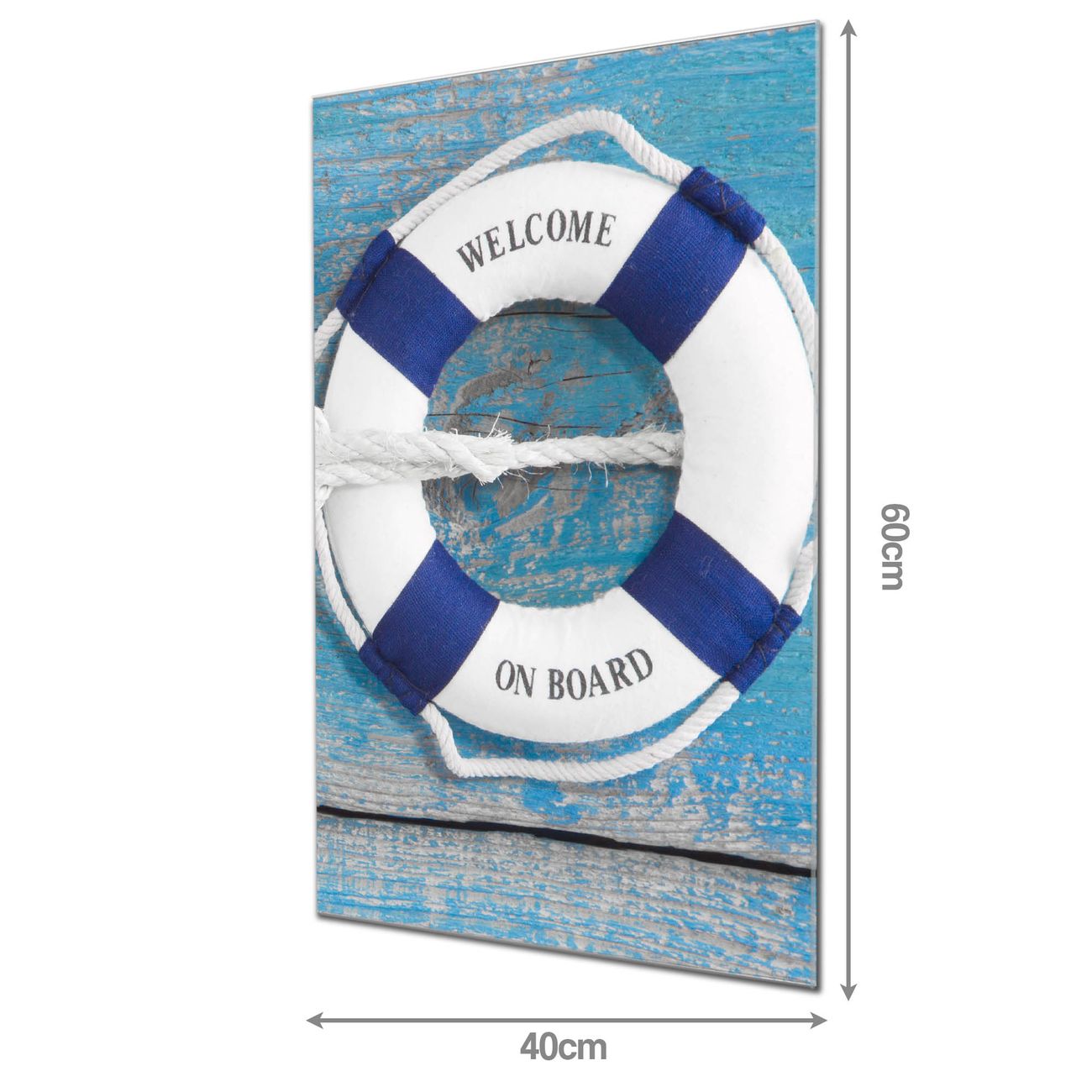 Material: 4mm Sicherheitsglas mit Metallrückwand Eigenschaften: beschreibbar, magnetisch, kratzfest Maße: 40x60x0,6cm, 3,60 kg schwer Motiv Nummer 12763 Blauer Rettungsring Zubehör: inklusive 4 Neodym-Magnete