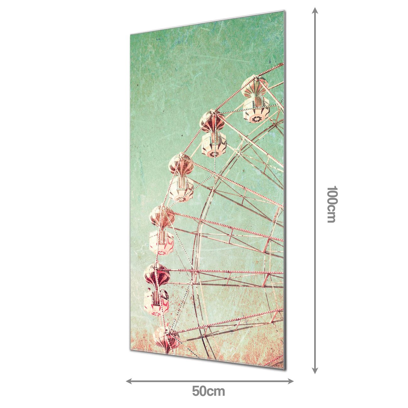 Material: 4mm Sicherheitsglas mit Metallrückwand Eigenschaften: beschreibbar, magnetisch, kratzfest Maße: 50x100x0,6cm, 7,50 kg schwer Motiv Nummer 11624 Riesenrad 1 Zubehör: inklusive 4 Neodym-Magnete