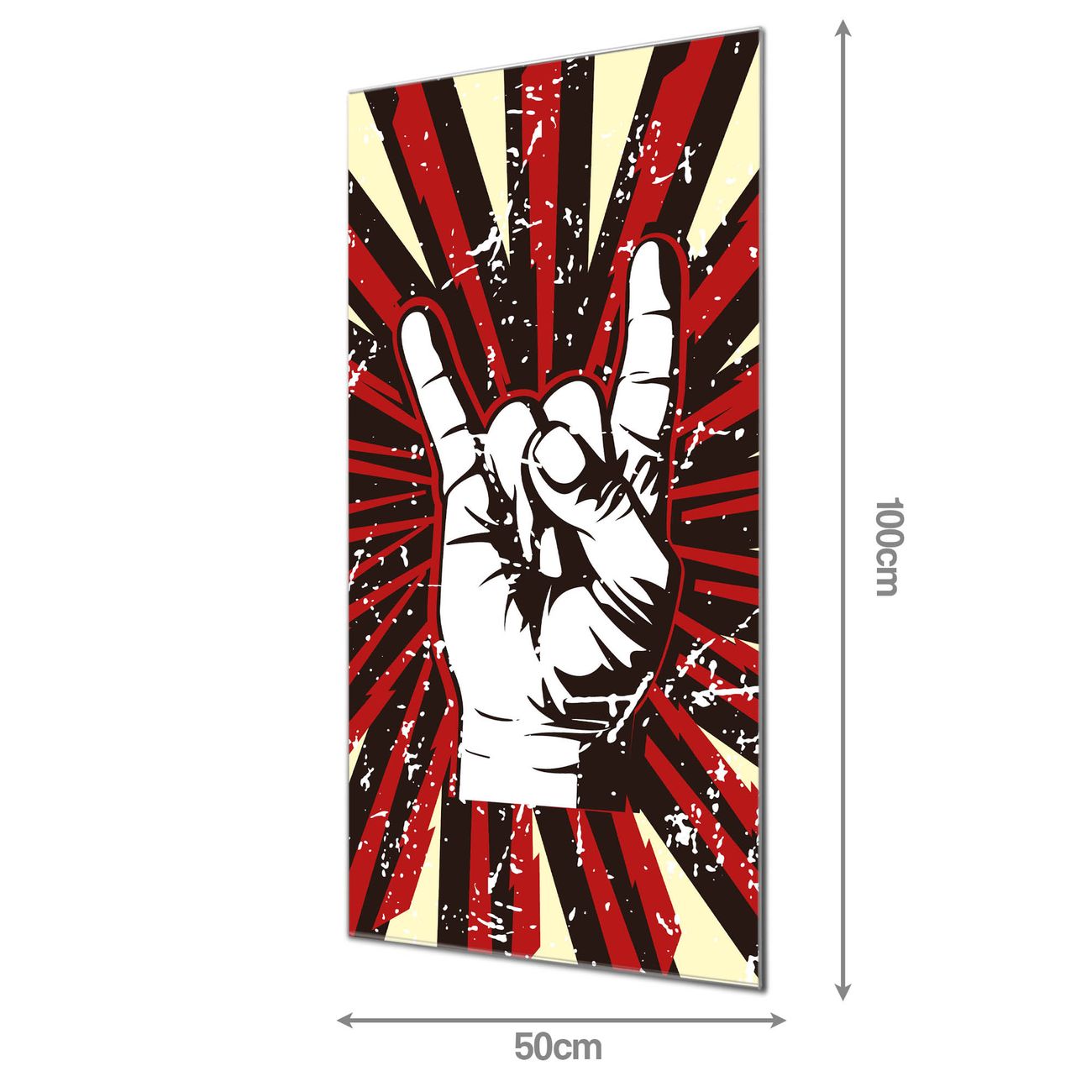 Material: 4mm Sicherheitsglas mit Metallrückwand Eigenschaften: beschreibbar, magnetisch, kratzfest Maße: 50x100x0,6cm, 7,50 kg schwer Motiv Nummer 10979 Rock On Zubehör: inklusive 4 Neodym-Magnete