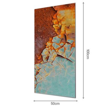 Material: 4mm Sicherheitsglas mit Metallrückwand Eigenschaften: beschreibbar, magnetisch, kratzfest Maße: 50x100x0,6cm, 7,50 kg schwer Motiv Nummer 12600 Rost und Blau Zubehör: inklusive 4 Neodym-Magnete