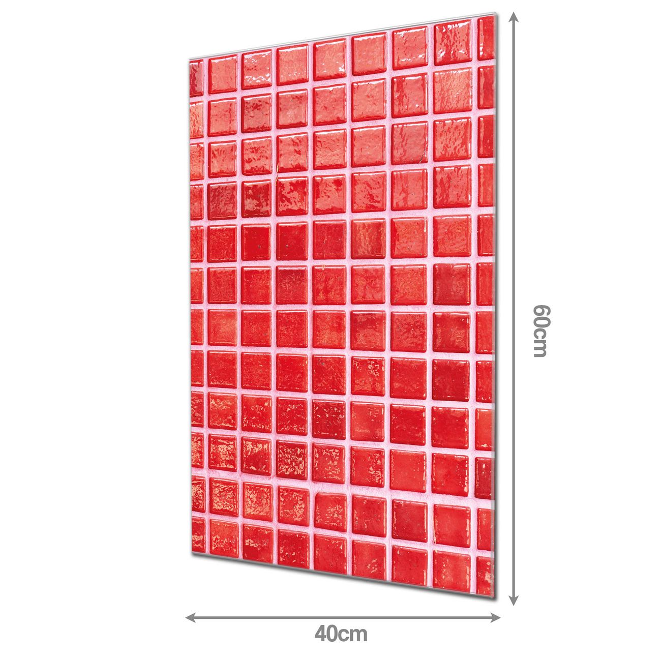 Material: 4mm Sicherheitsglas mit Metallrückwand Eigenschaften: beschreibbar, magnetisch, kratzfest Maße: 40x60x0,6cm, 3,60 kg schwer Motiv Nummer 11359 Rote Kacheln Zubehör: inklusive 4 Neodym-Magnete