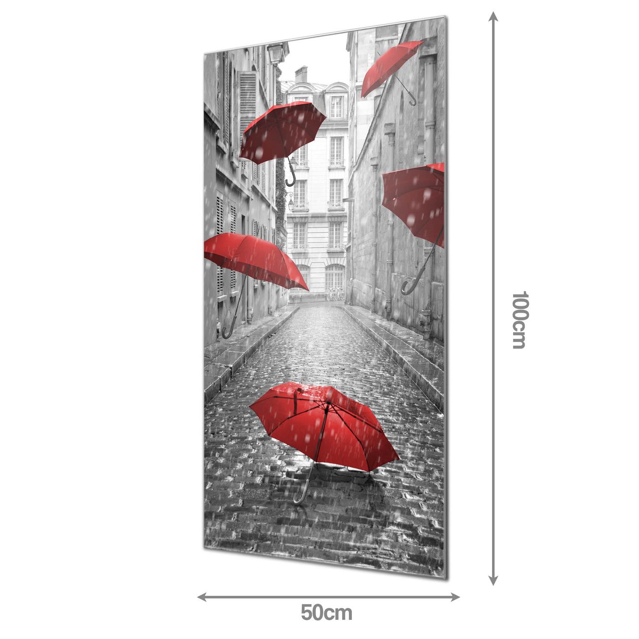 Material: 4mm Sicherheitsglas mit Metallrückwand Eigenschaften: beschreibbar, magnetisch, kratzfest Maße: 50x100x0,6cm, 7,50 kg schwer Motiv Nummer 10866 Rote Schirme Zubehör: inklusive 4 Neodym-Magnete