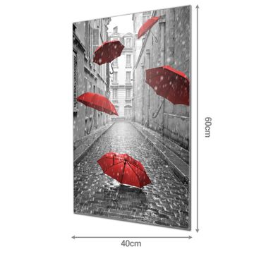 Material: 4mm Sicherheitsglas mit Metallrückwand Eigenschaften: beschreibbar, magnetisch, kratzfest Maße: 40x60x0,6cm, 3,60 kg schwer Motiv Nummer 10866 Rote Schirme Zubehör: inklusive 4 Neodym-Magnete