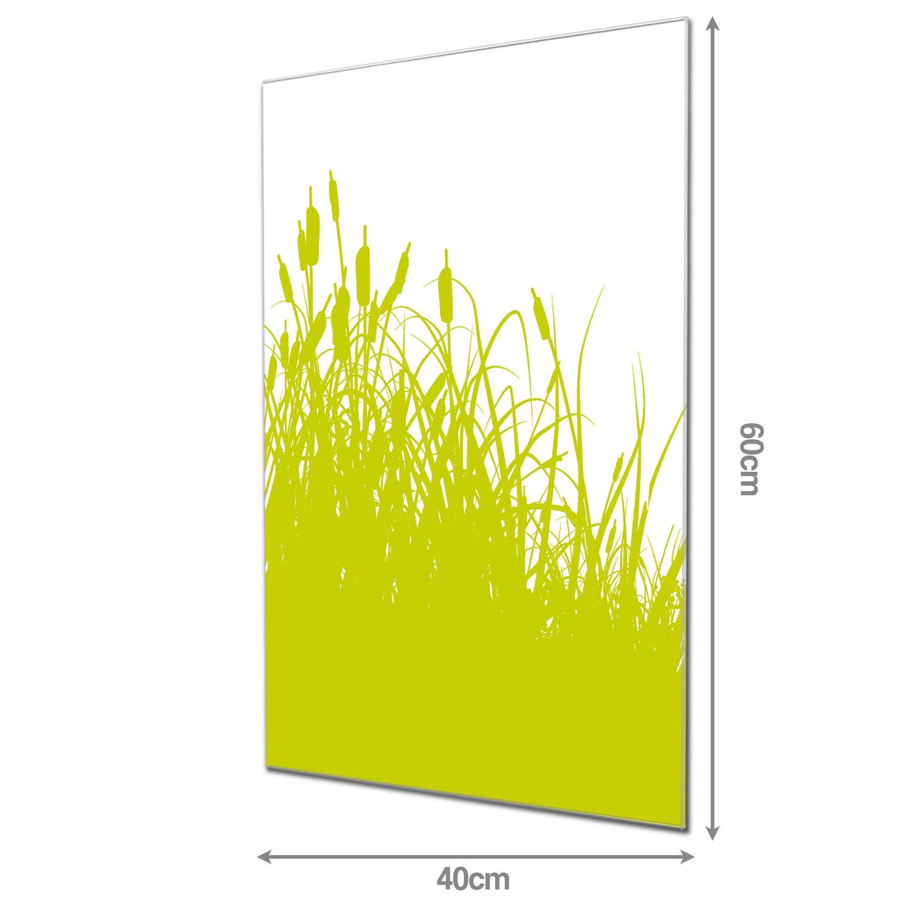 Material: 4mm Sicherheitsglas mit Metallrückwand Eigenschaften: beschreibbar, magnetisch, kratzfest Maße: 40x60x0,6cm, 3,60 kg schwer Motiv Nummer 10371 Schilf Zubehör: inklusive 4 Neodym-Magnete
