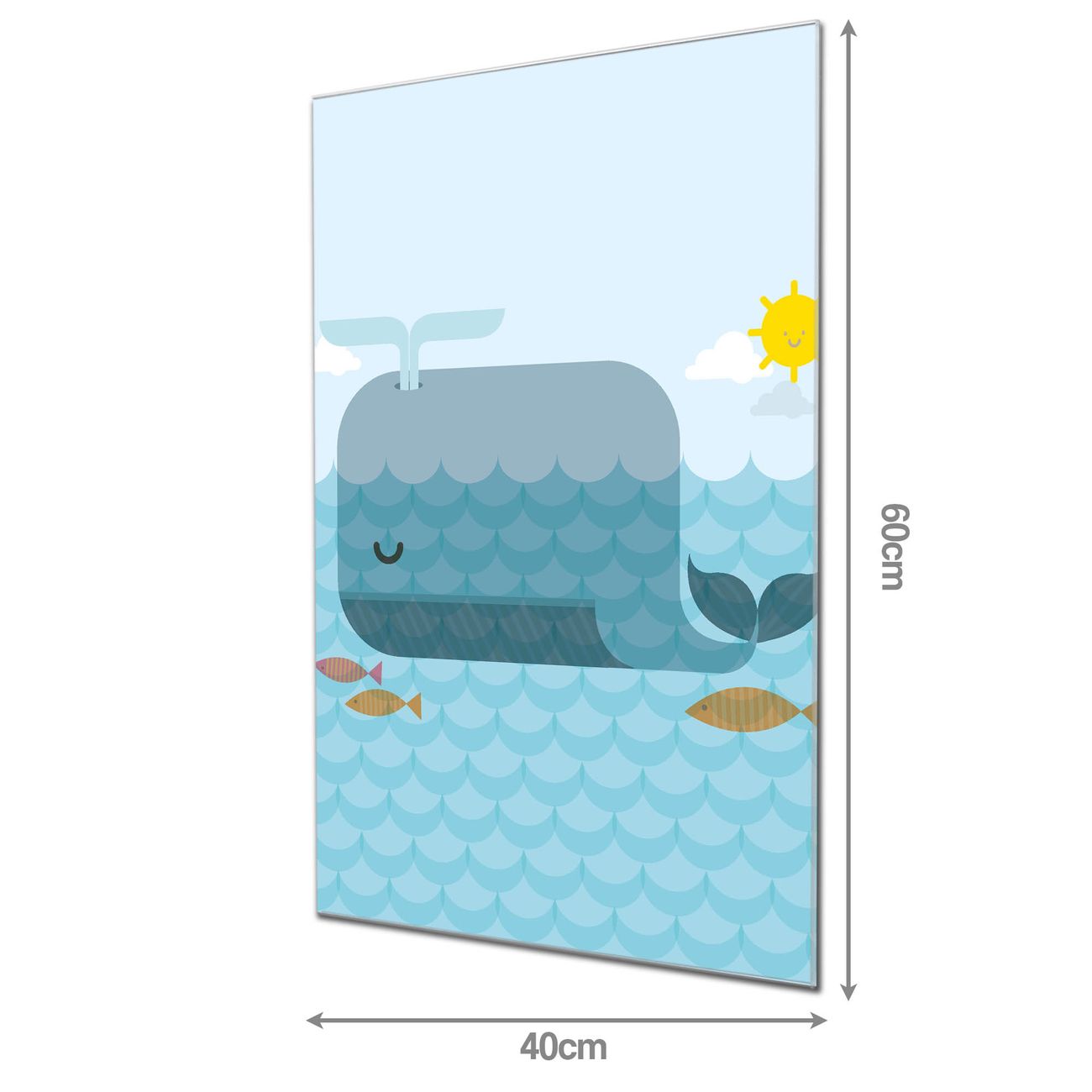 Material: 4mm Sicherheitsglas mit Metallrückwand Eigenschaften: beschreibbar, magnetisch, kratzfest Maße: 40x60x0,6cm, 3,60 kg schwer Motiv Nummer 11765 Schlafender Wal Zubehör: inklusive 4 Neodym-Magnete