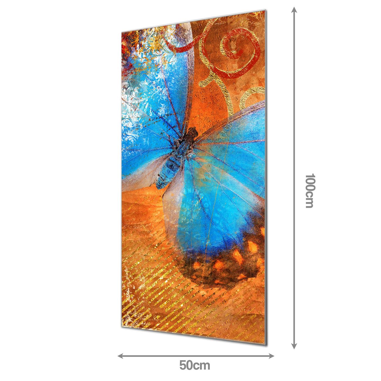 Material: 4mm Sicherheitsglas mit Metallrückwand Eigenschaften: beschreibbar, magnetisch, kratzfest Maße: 50x100x0,6cm, 7,50 kg schwer Motiv Nummer 10069 Schmetterling Zubehör: inklusive 4 Neodym-Magnete