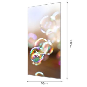 Material: 4mm Sicherheitsglas mit Metallrückwand Eigenschaften: beschreibbar, magnetisch, kratzfest Maße: 50x100x0,6cm, 7,50 kg schwer Motiv Nummer 12441 Seifenblasen Zubehör: inklusive 4 Neodym-Magnete