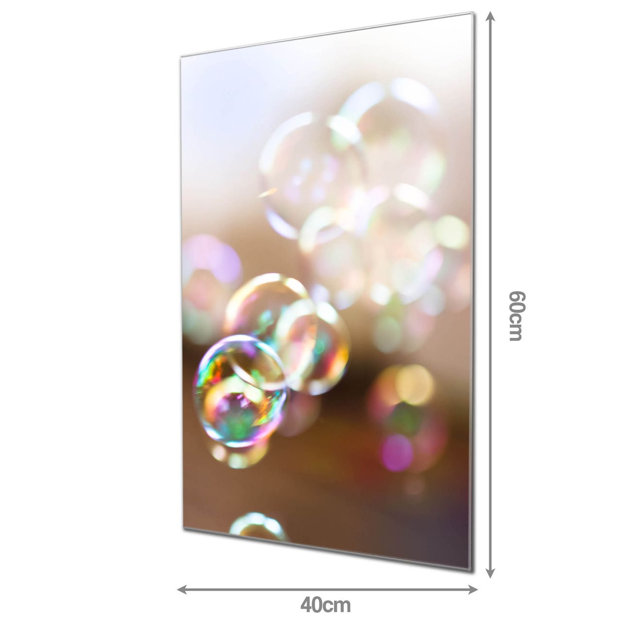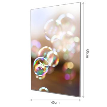 Material: 4mm Sicherheitsglas mit Metallrückwand Eigenschaften: beschreibbar, magnetisch, kratzfest Maße: 40x60x0,6cm, 3,60 kg schwer Motiv Nummer 12441 Seifenblasen Zubehör: inklusive 4 Neodym-Magnete
