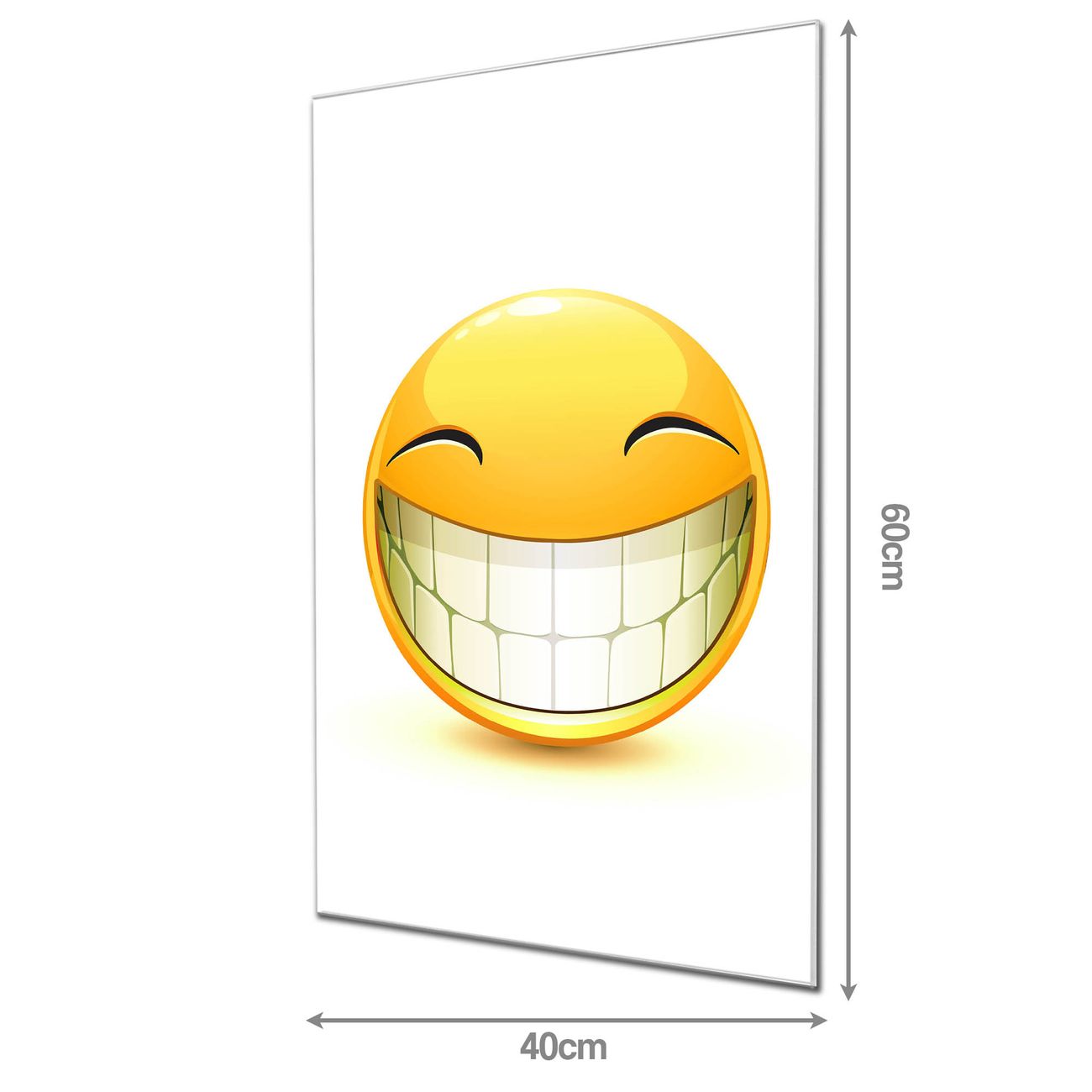 Material: 4mm Sicherheitsglas mit Metallrückwand Eigenschaften: beschreibbar, magnetisch, kratzfest Maße: 40x60x0,6cm, 3,60 kg schwer Motiv Nummer 10188 Smile Zubehör: inklusive 4 Neodym-Magnete