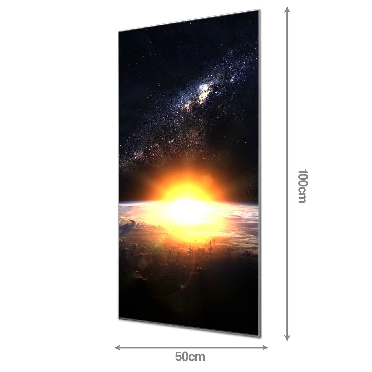 Material: 4mm Sicherheitsglas mit Metallrückwand Eigenschaften: beschreibbar, magnetisch, kratzfest Maße: 50x100x0,6cm, 7,50 kg schwer Motiv Nummer 12532 Sonne im Weltall Zubehör: inklusive 4 Neodym-Magnete