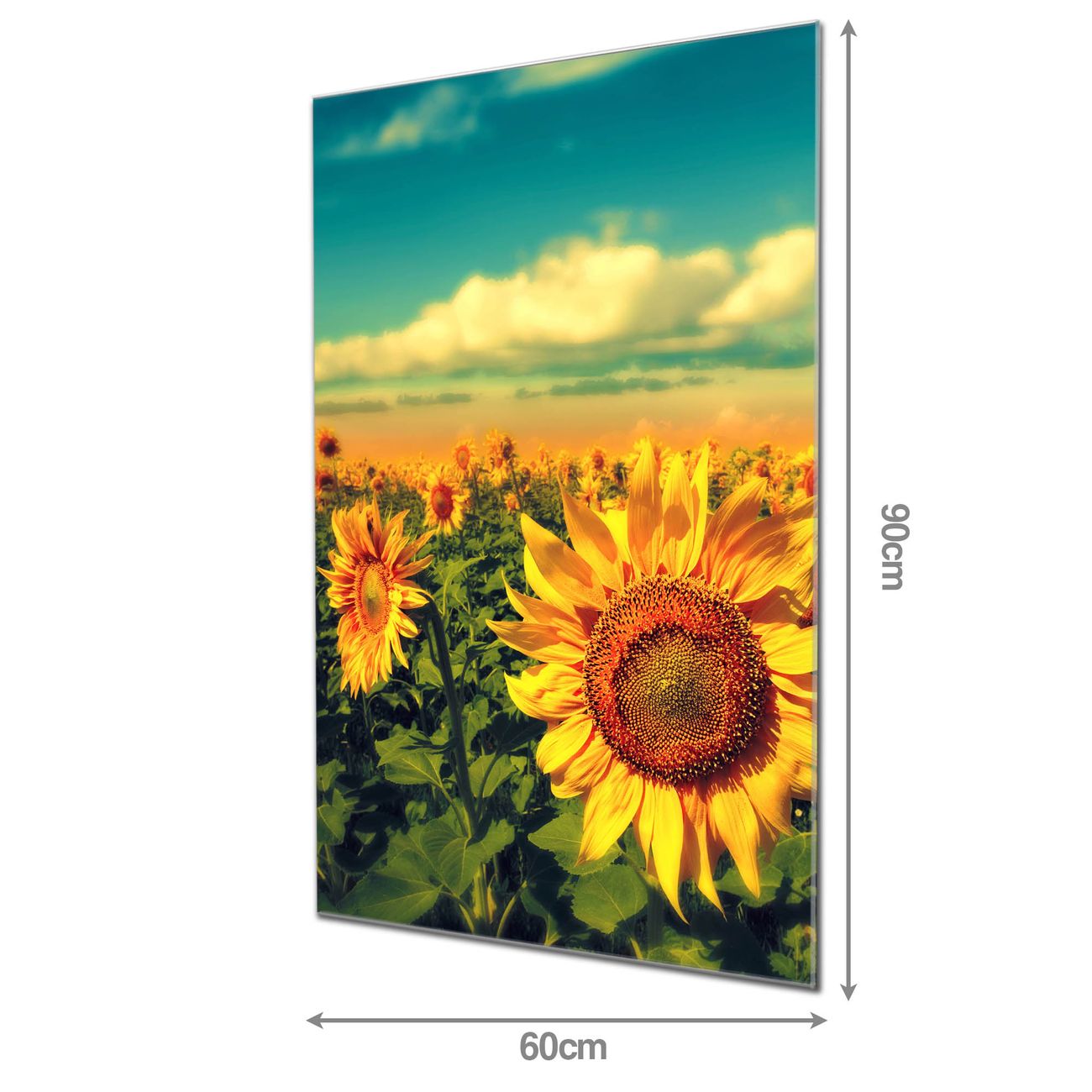Material: 4mm Sicherheitsglas mit Metallrückwand Eigenschaften: beschreibbar, magnetisch, kratzfest Maße: 60x90x0,6cm, 8,10 kg schwer Motiv Nummer 10886 Sonnenblumen Zubehör: inklusive 4 Neodym-Magnete