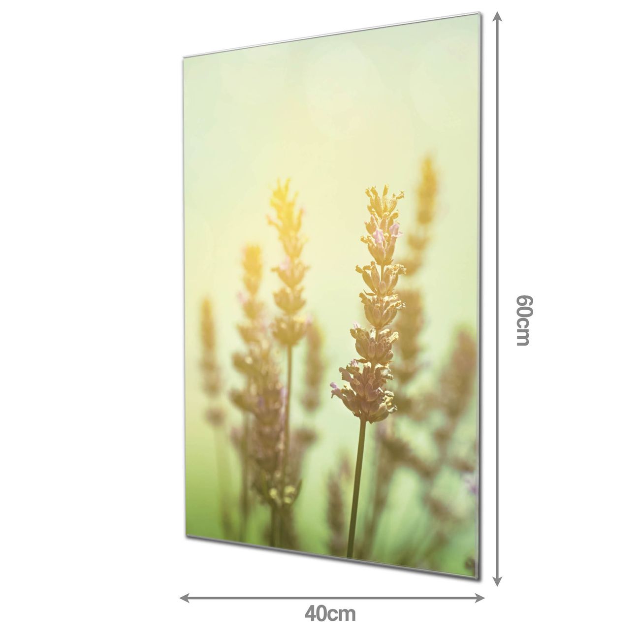 Material: 4mm Sicherheitsglas mit Metallrückwand Eigenschaften: beschreibbar, magnetisch, kratzfest Maße: 40x60x0,6cm, 3,60 kg schwer Motiv Nummer 11622 Sonnenlavendel Zubehör: inklusive 4 Neodym-Magnete