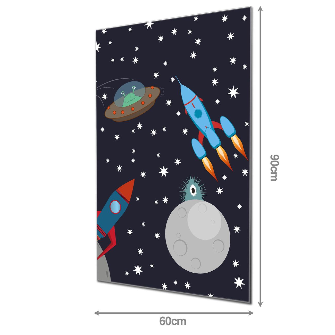 Material: 4mm Sicherheitsglas mit Metallrückwand Eigenschaften: beschreibbar, magnetisch, kratzfest Maße: 60x90x0,6cm, 8,10 kg schwer Motiv Nummer 10401 Space Traffic Zubehör: inklusive 4 Neodym-Magnete
