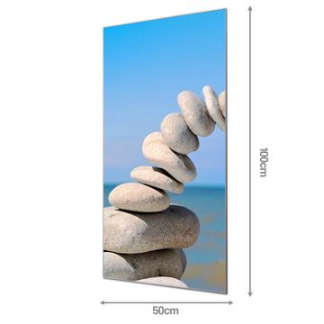 Material: 4mm Sicherheitsglas mit Metallrückwand Eigenschaften: beschreibbar, magnetisch, kratzfest Maße: 50x100x0,6cm, 7,50 kg schwer Motiv Nummer 10024 Steine&Meer Zubehör: inklusive 4 Neodym-Magnete