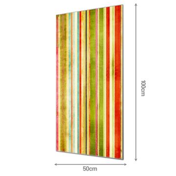Material: 4mm Sicherheitsglas mit Metallrückwand Eigenschaften: beschreibbar, magnetisch, kratzfest Maße: 50x100x0,6cm, 7,50 kg schwer Motiv Nummer 10050 Streifen Zubehör: inklusive 4 Neodym-Magnete