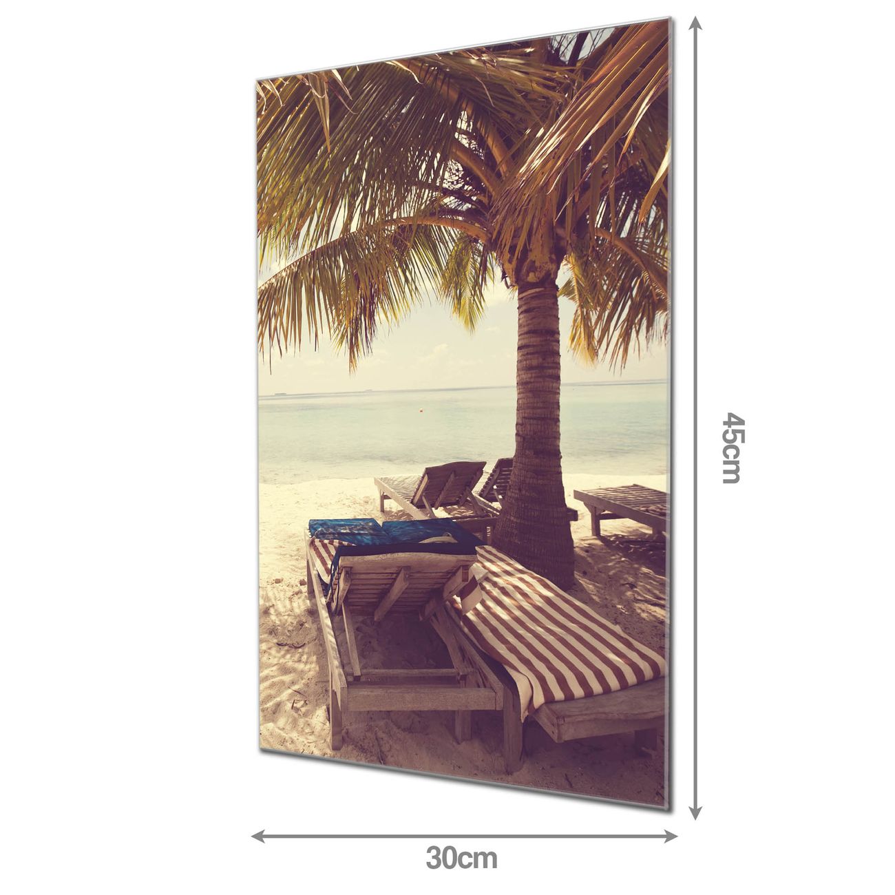 Material: 4mm Sicherheitsglas mit Metallrückwand Eigenschaften: beschreibbar, magnetisch, kratzfest Maße: 30x45x0,6cm, 2,03 kg schwer Motiv Nummer 11922 Südseestrand Zubehör: inklusive 4 Neodym-Magnete