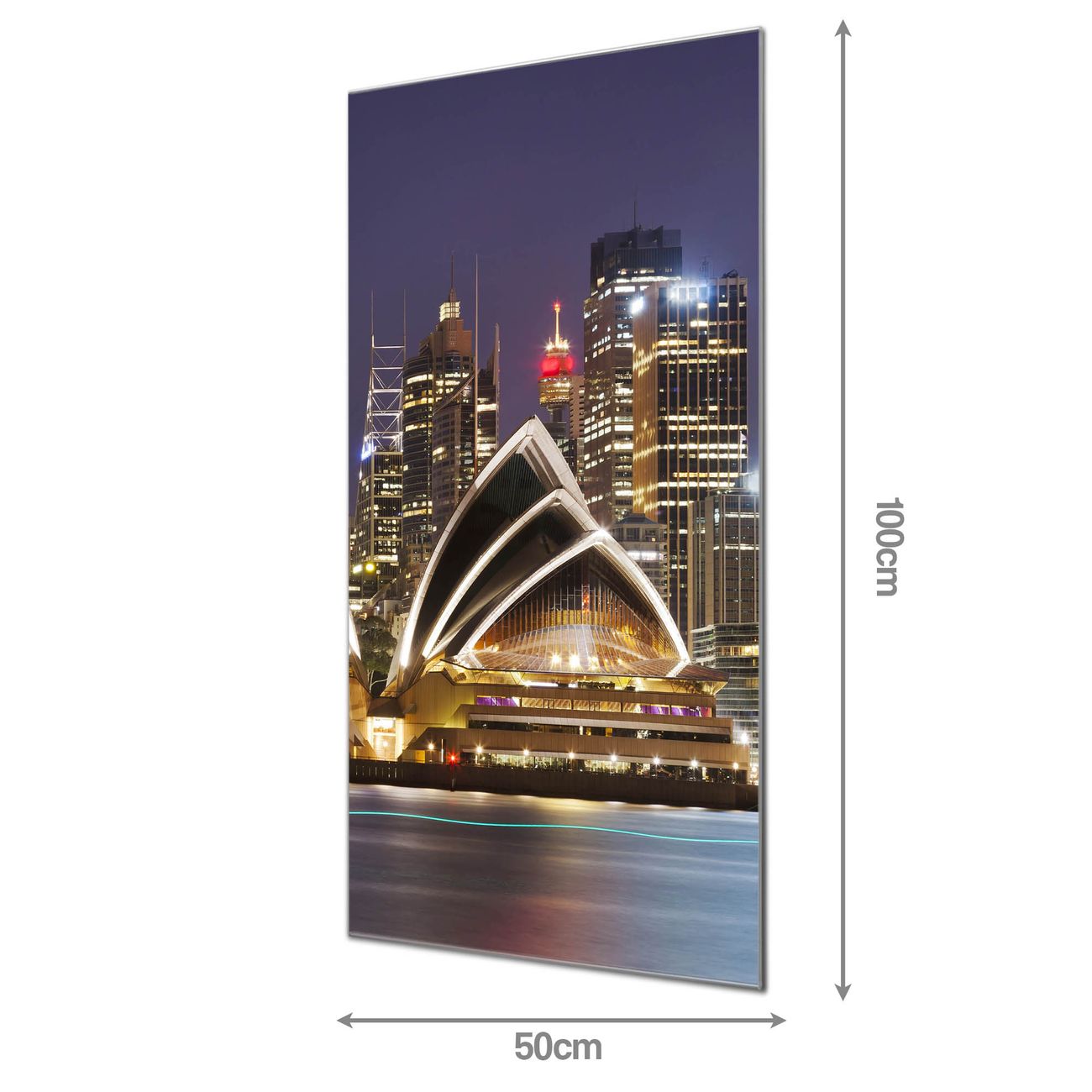Material: 4mm Sicherheitsglas mit Metallrückwand Eigenschaften: beschreibbar, magnetisch, kratzfest Maße: 50x100x0,6cm, 7,50 kg schwer Motiv Nummer 11117 Sydney Zubehör: inklusive 4 Neodym-Magnete