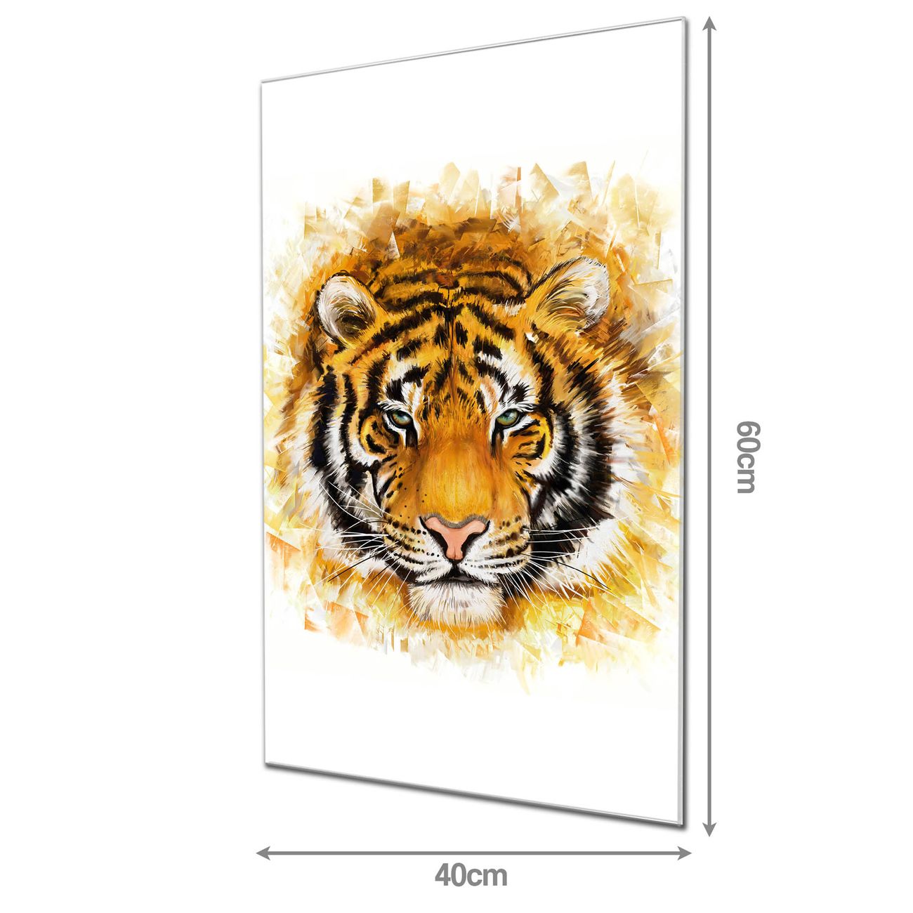 Material: 4mm Sicherheitsglas mit Metallrückwand Eigenschaften: beschreibbar, magnetisch, kratzfest Maße: 40x60x0,6cm, 3,60 kg schwer Motiv Nummer 12328 Tigerkopf Zubehör: inklusive 4 Neodym-Magnete