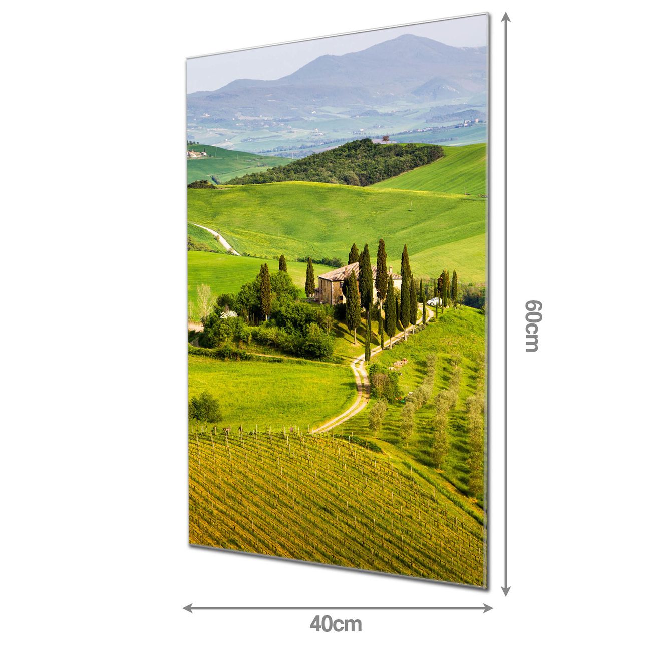 Material: 4mm Sicherheitsglas mit Metallrückwand Eigenschaften: beschreibbar, magnetisch, kratzfest Maße: 40x60x0,6cm, 3,60 kg schwer Motiv Nummer 12316 Toskana Zubehör: inklusive 4 Neodym-Magnete