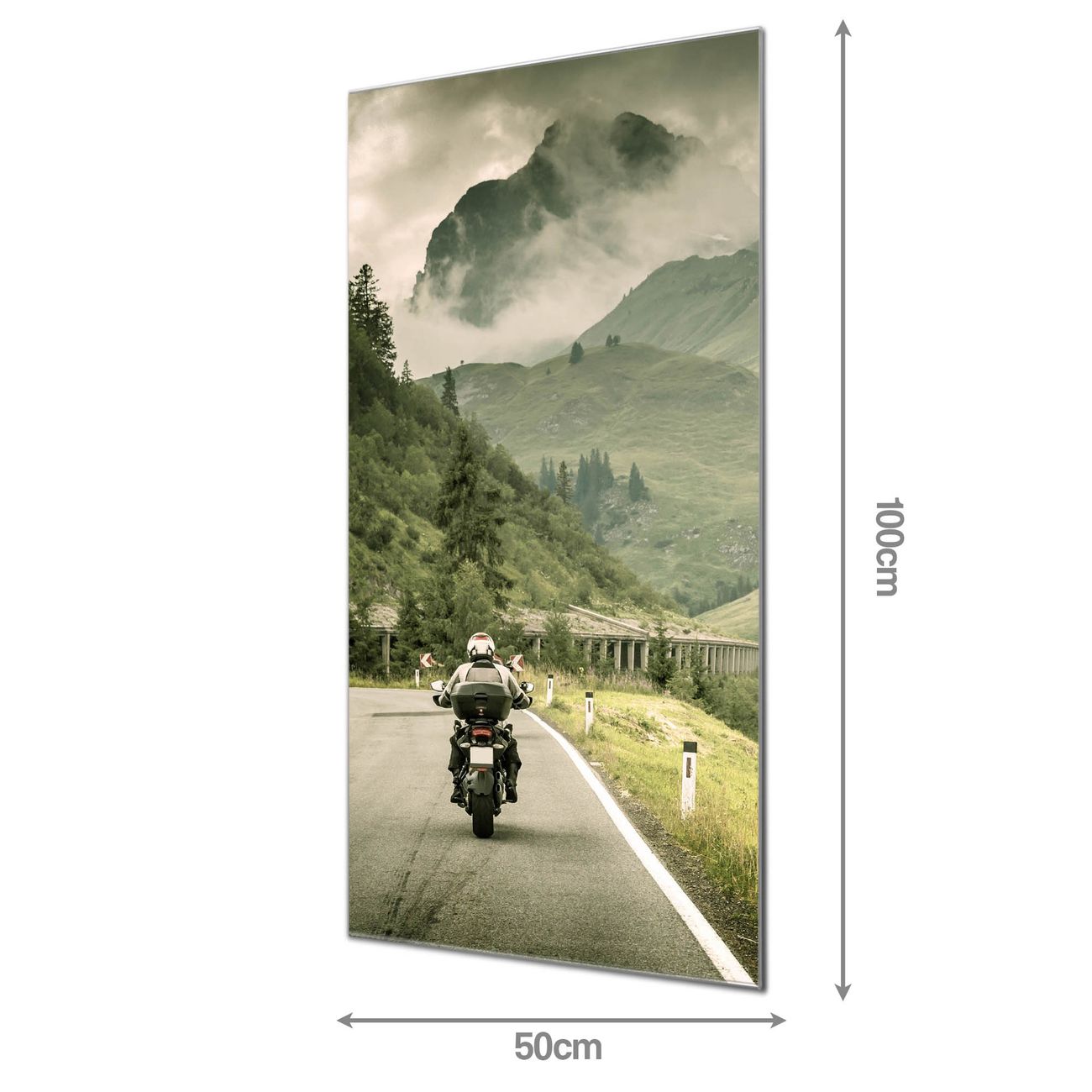 Material: 4mm Sicherheitsglas mit Metallrückwand Eigenschaften: beschreibbar, magnetisch, kratzfest Maße: 50x100x0,6cm, 7,50 kg schwer Motiv Nummer 11142 Transalp Zubehör: inklusive 4 Neodym-Magnete