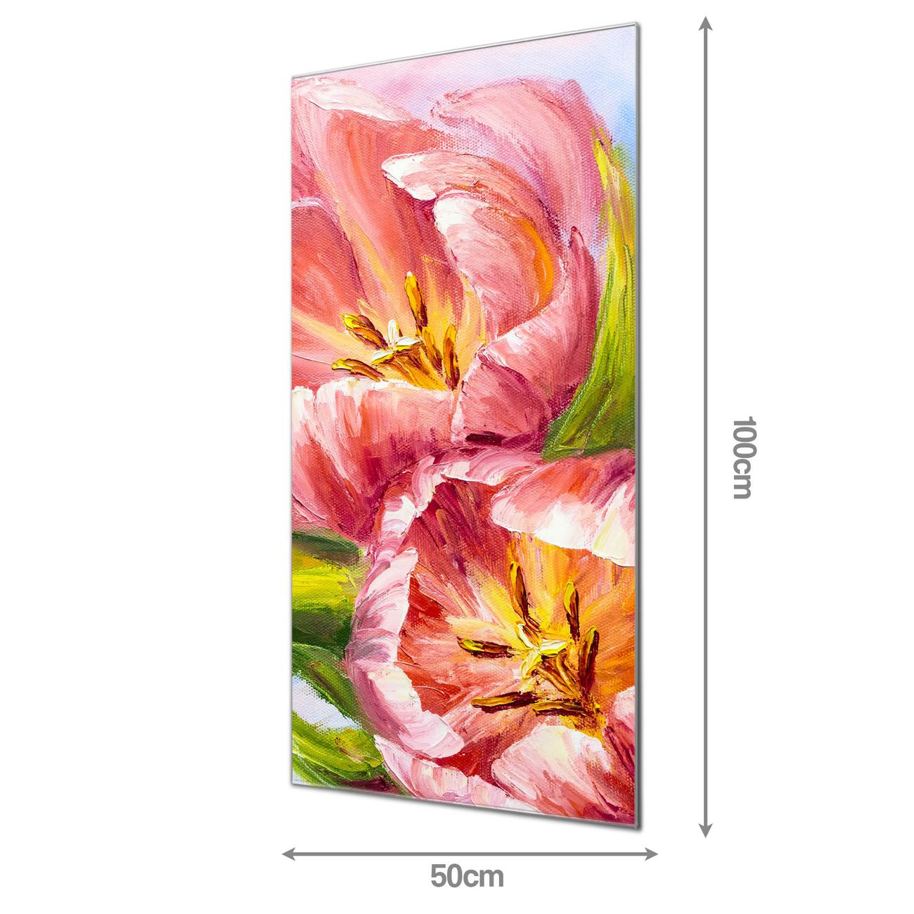 Material: 4mm Sicherheitsglas mit Metallrückwand Eigenschaften: beschreibbar, magnetisch, kratzfest Maße: 50x100x0,6cm, 7,50 kg schwer Motiv Nummer 12342 Tulpen Detail Zubehör: inklusive 4 Neodym-Magnete