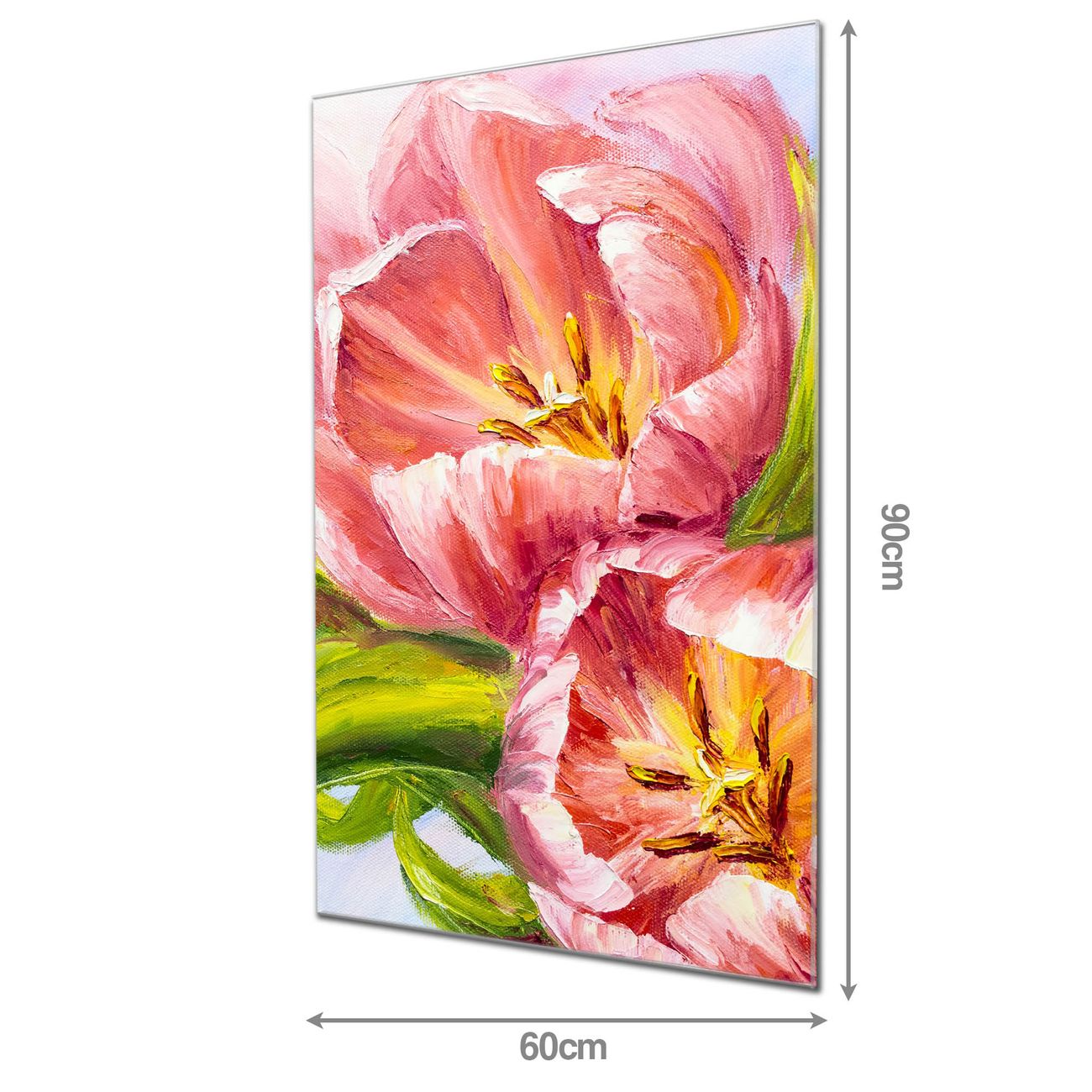 Material  4mm Sicherheitsglas mit Metallrückwand Eigenschaften  beschreibbar, magnetisch, kratzfest Maße  60x90x0,6cm, 8,10 kg schwer Motiv  Nummer 12342 Tulpen Detail Zubehör  inklusive 4 Neodym-Magnete