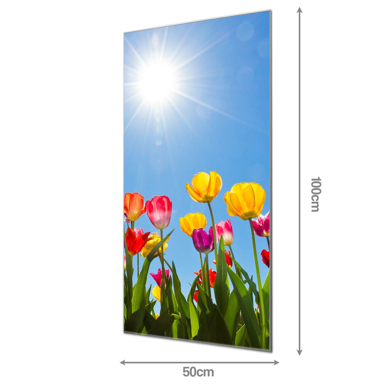 Material: 4mm Sicherheitsglas mit Metallrückwand Eigenschaften: beschreibbar, magnetisch, kratzfest Maße: 50x100x0,6cm, 7,50 kg schwer Motiv Nummer 10211 Tulpenmeer Zubehör: inklusive 4 Neodym-Magnete