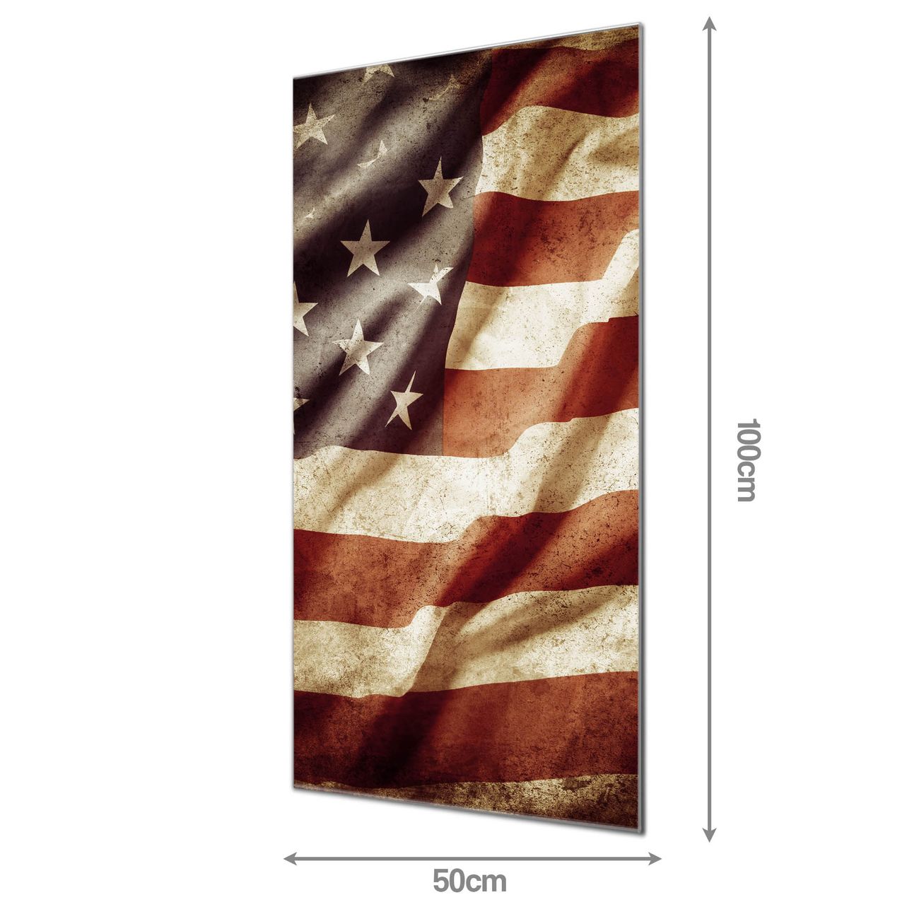 Material: 4mm Sicherheitsglas mit Metallrückwand Eigenschaften: beschreibbar, magnetisch, kratzfest Maße: 50x100x0,6cm, 7,50 kg schwer Motiv Nummer 10776 United States Zubehör: inklusive 4 Neodym-Magnete